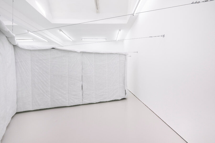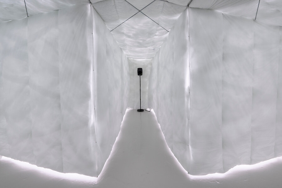 Radial arm maze made from synthetic duvets (15 single, 21 double), hog rings, high tensile steel cable, turnbuckles & hardware, 5 channel audio created from hundreds of vocal samples recorded by the artist 11:52 (looping). Sound design by Richy Carey, 2018-2024