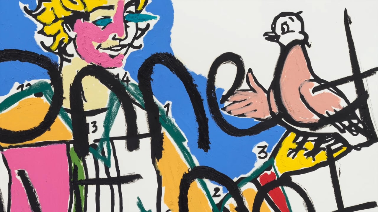 On the gallery walls hang six large screenprints, in which Smith has worked over illustrations from an educative handbook for juveniles exposed to the justice system in vast, waxy multicolour scrawls and scratches. They offer, to coin a phrase, a travesty of justice. In Colouring Book 38, a jury bench is engulfed in black strokes and white washes, overseen by an obscured radiant sun, while in Colouring Book 39, the brightly robed ‘Judge Friendly’ addresses a pink bird, although with one eye obscured by a patch of red, the magistrate more closely resembles a ridiculous pirate. ‘This isn’t a costume’, says the judge, reads a text below the image. With a newly apricot face and colourless robes, the Judge reappears in the diptych Colouring Book 36 alongside a blacked-out police officer and two faceless children who loom beside a globe. Like the motto on an imperial crest, a legend runs along the bottom: ‘If we all work together, we can make the world a better place.’ For all its childish simplicity, this series conjures the experience of a system in which the rules are unknown and the odds are stacked like loaded dice.
