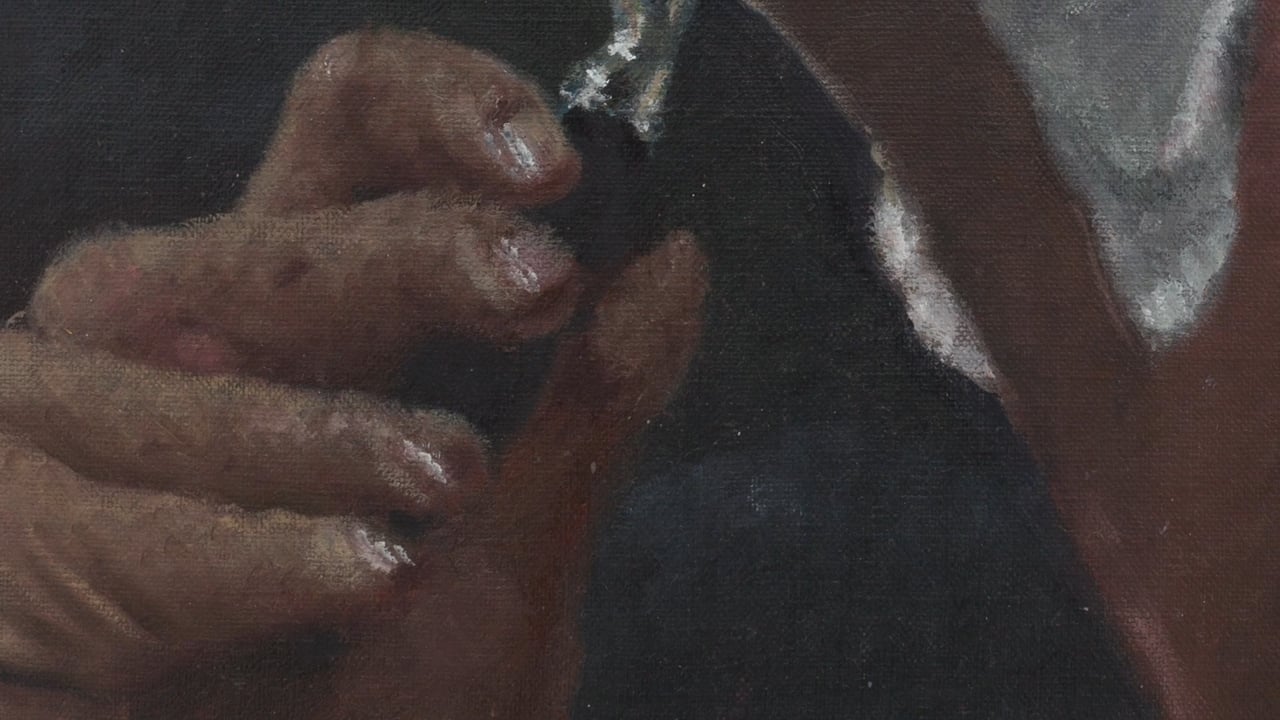 Issy Wood’s constellation of images suggests a stream of consciousness hiding something foreboding, a medieval current creeping into the millennial. Merging the material and immaterial, objects and beliefs, her work empties the contemporary of clarity and releases spirits presumed to belong to the past with an incisive binge of symbols: sphinx-like women with bodies embedded in high-end decorative objects, faceless 19th century maidens with buttery skin, false nails, silver tableware and fussy necklaces, leather trenches and lux car interiors, Judith Leiber minaudieres, and various portraits of Joan Rivers.At an age that belies her anachronistic rendering style, Wood calibrates her skillful depiction of these personal ciphers with their own effacement. Unlikely crops, implausible vantage points, and uncanny layering—coupled with a “lazy smudgy Renoir pointillism” as she describes it—disrupt moments of mimetic allure with the threat of its undoing. Often just shy of trompe-l’oeil, her paintings give illusionistic entry to an inner world that bares traces of a haunted external one, surreptitiously infiltrating Wood’s most private self.