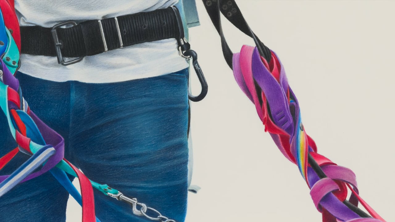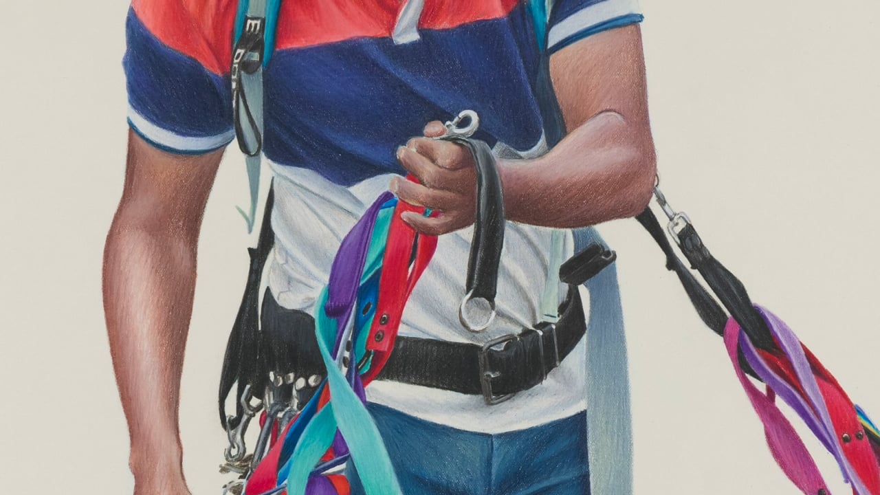 Middleton met with a professional dog-walker in Buenos Aires, where he photographed him at work in exchange for promotional photographs. In these drawings the dogs themselves have been ommitted, focusing instead on his body and the tangled system of leads, clips and chains that binds them all together.