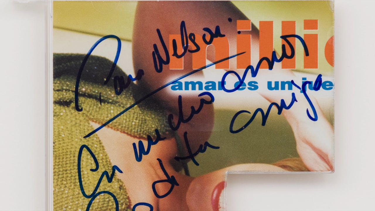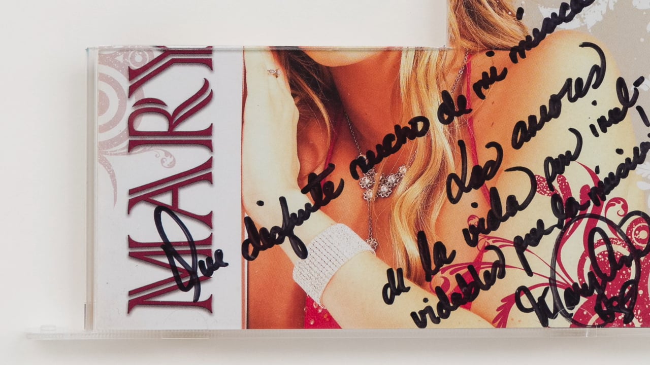 A new series of frames titled Repeating the Encounter each contain cut-out portions of autographed CD covers the artist acquired on eBay. The original owner, Nelson, had an extensive CD collection of Latin American recording artists who had visited and performed on the island of Puerto Rico, where he grew up. The musical ephemera marks a number of encounters between the hobbyist collector and the 90s salsa pop stars with whom he came into contact.