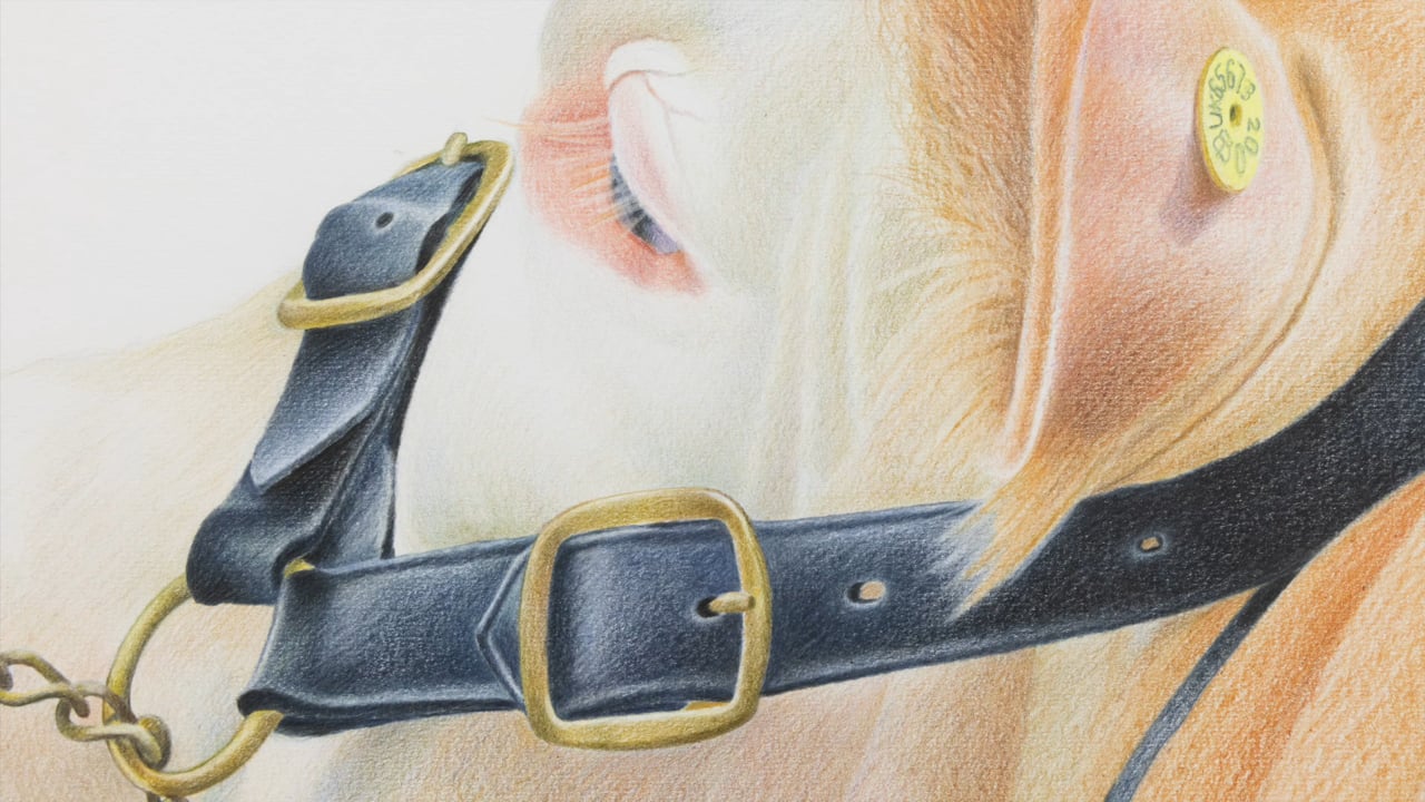 This work is from an ongoing series of drawings by Stuart Middleton, based on photographs taken by the artist. They are rendered smoothly in coloured pencil and depict cattle being exhibited at a county show. The young handler twists her charges’ head to present the animal’s best side to the judge. Stiffly dressed in formal clothes, her attention is focussed away from the viewer, as she struggles to hold the cattle still. The cattle are judged on criteria including musculature for meat, udder proportion, skeletal structure for bearing calves. The tender way these beasts are curried and dressed contrasts with the violence implied by judging, capturing the tension of husbandry; of living stock.