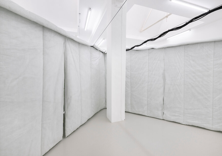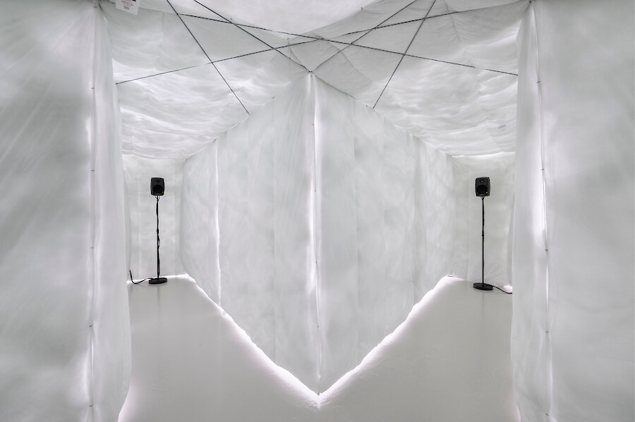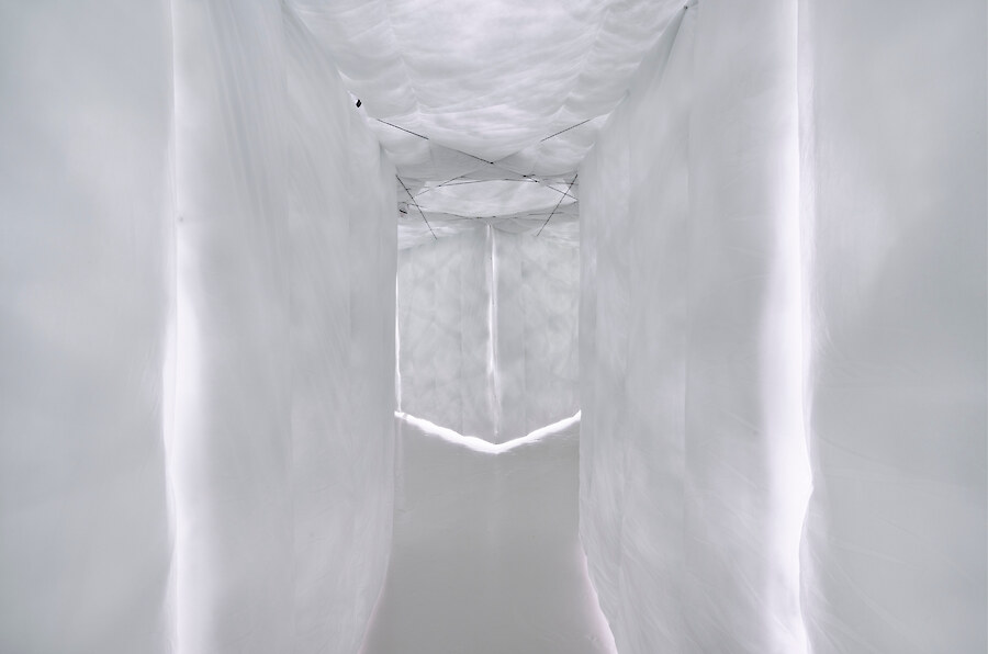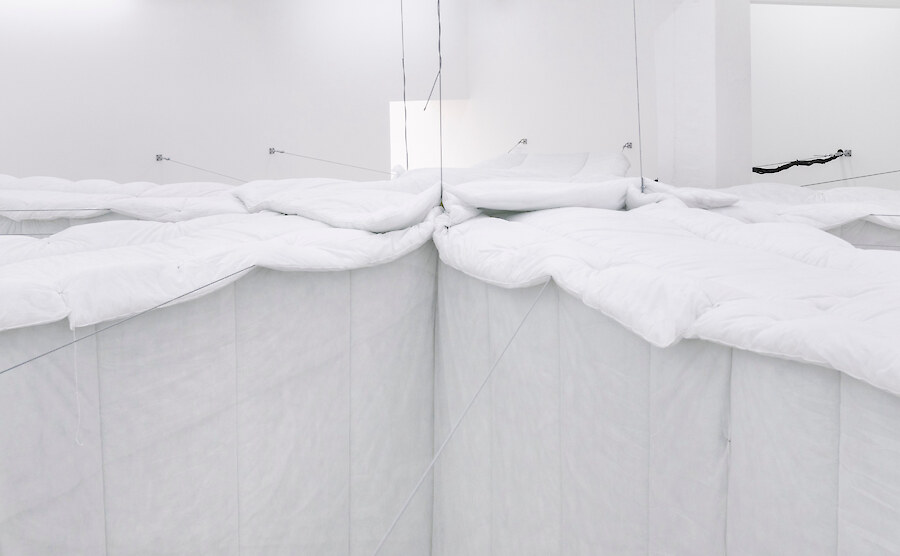 Radial arm maze made from synthetic duvets (15 single, 21 double), hog rings, high tensile steel cable, turnbuckles & hardware, 5 channel audio created from hundreds of vocal samples recorded by the artist 11:52 (looping). Sound design by Richy Carey, 2018-2024